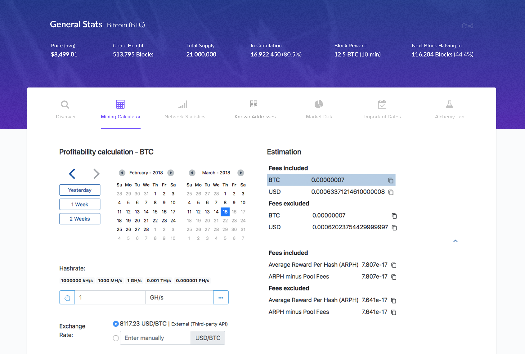 Another requirement was to implement calculations and estimations based on blockchain parameters such as the difficulty, the hashrate and having an address watching feature.