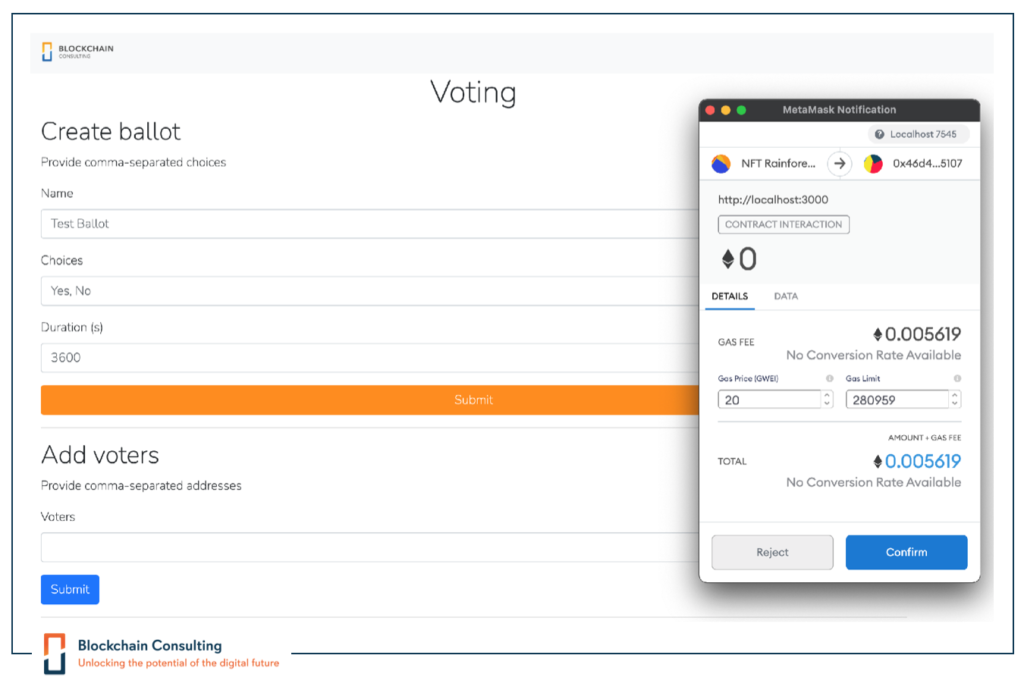Voting is a fundamental right of citizens who live in a democracy. We at Blockchain Consulting were approached several times to evaluate voting systems. Despite the obvious advantages of using blockchain for voting, there are also some problems such as vote privacy. For years, people have been struggling to find workarounds for these downsides, and it still remains hard to find solutions. In 2021, we decided to develop our own voting application and to use it for in-house purposes. Our goal was to find solutions to some of the problems that could not be solved yet.